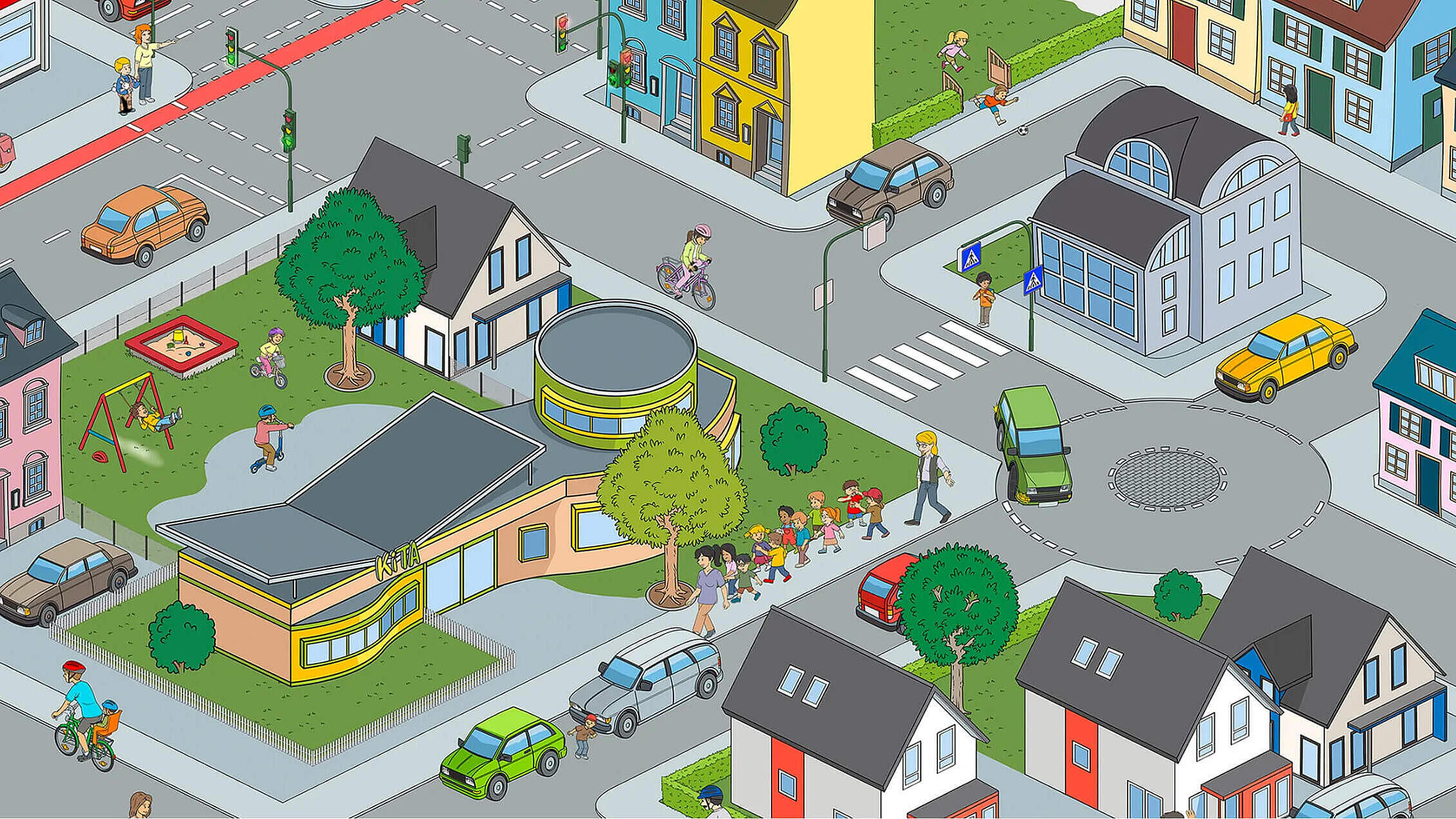 Welchen kritischen Situationen begegnen deine Kinder im Verkehrsalltag? Unser interaktives Wimmelbild bietet viele Verkehrsinformationen, Tipps, Videos und Materialien.