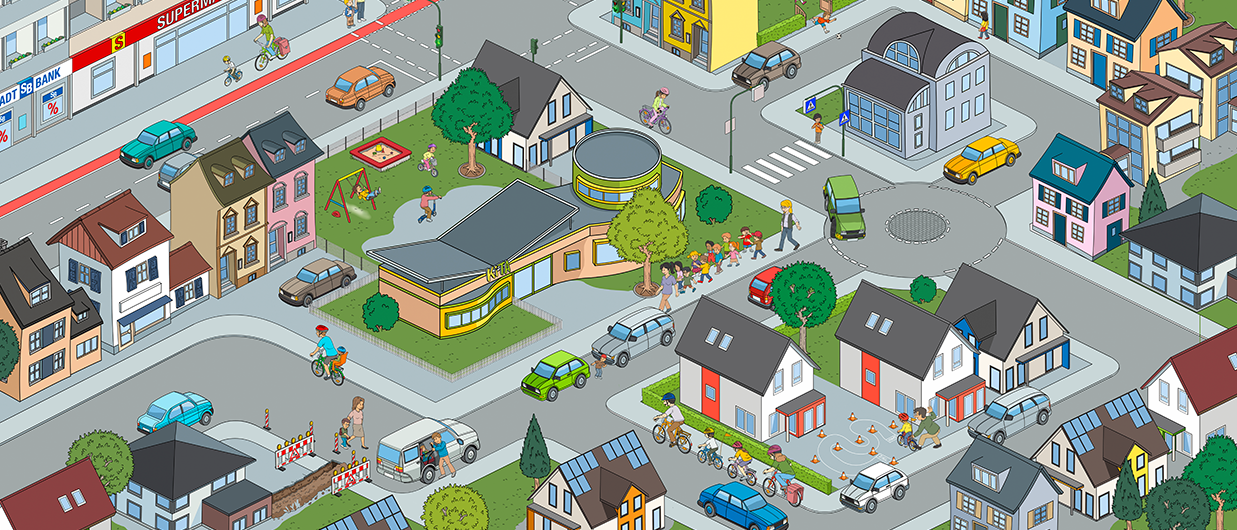 Interaktives Wimmelbild mit vielen Verkehrsinformationen für den Alltag mit Kindern.